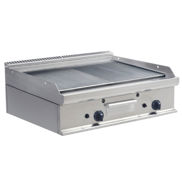 – Materiaal: roestvrij staal – 2 apart regelbare kookzones – Braadplaat 1/2 glad en 1/2 gegroefd – RVS spatschermen aan drie zijden – Uitneembare vetopvangbak – Piëzo-ontsteker – Waakvlam – ontstekingszekering – Vooraf ingesteld op H-gas, inclusief propaansproeiers – Gewicht: 95 kg – Afmetingen: B 800, bakplaat: 795 x D 700, bakplaat: 530 x H 270 – Temperatuur 100 /+270 °C – Aansluiting: 12 kW