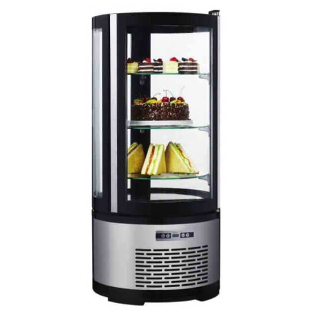 – Materiaal: (behuizing) kunststof met roestvrijstalen front – Dubbel glas – 3 in hoogte verstelbare glazen schappen – Glasplaatafstand: 168 mm – Handmatig draaibare schappen – LED binnenverlichting aan 2 zijden, apart schakelbaar – Digitale temperatuurregeling – Geforceerde luchtkoeling – Automatische ontdooiing – Temperatuur +2 /+8 °C – Aansluiting: 230 V – 50 Hz – 0,1 kW – Roosters (glazen planken, rond): 3x diam. 390mm – Inhoud: 100 liter – Externe afmeting: diam. 480 x H1030mm – Gewicht: 55 kg – Koelmiddel: R600a – Energie-efficiëntieklasse: C (spectrum A tot G) – Geschikt voor taarten ook onafgedekt ivm Glazen plaat