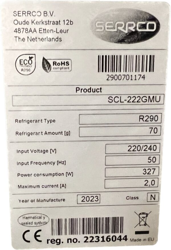 Serrco SCL-222GMU Glasdeurkoeling met Gekleurde LED 2023 NIEUW